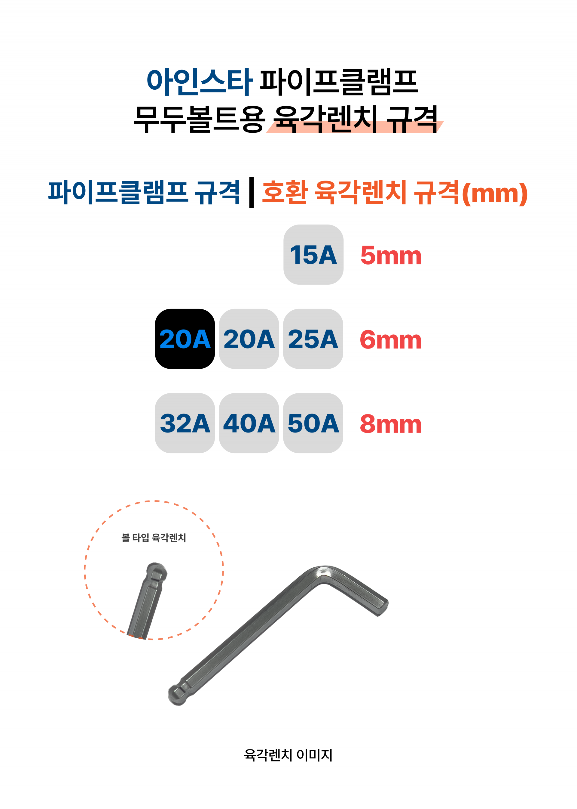 | 클램프 규격 | 클램프 내경 | 파이프 외경 | 육각렌치 |